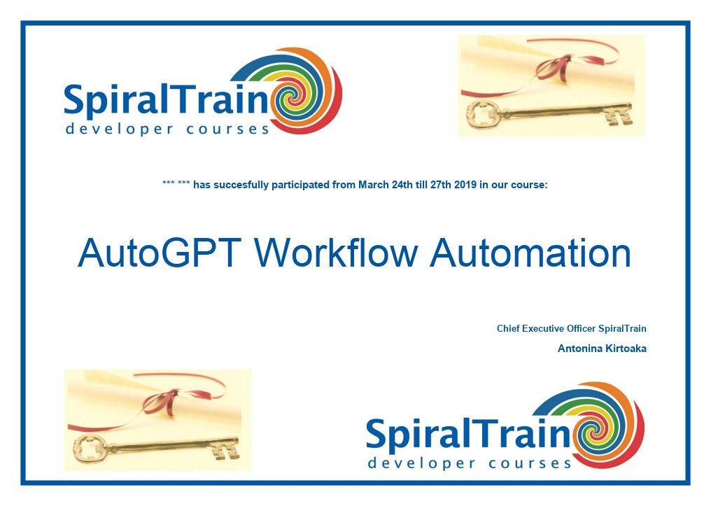The course AutoGPT Workflow Automation from SpiralTrain teaches you how to build autonomous AI agents using AutoGPT and similar frameworks. You will learn how to design self-directed workflows, integrate tools and APIs, manage memory and context, and create intelligent agents that can accomplish complex tasks with minimal human intervention.